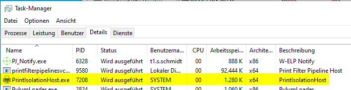 As a result, the job seems to remain in the queue with status 'Printing' but it is not printing at all or the job is just not processed by ELP. One way to continue is to delete the job and restart the spooler and kill the task PrintIsolationHost.exe in the Windows Task Manager. This might be repeated several times until no task PrintIsolationHost.exe  appears any more. Please note that if this task is running and the W-ELP Kernel convert.exe is not running then the root cause of the PrintIsolationHost is not W-ELP related but related to another Windows driver (which is also not good at all but not in our responsibility).