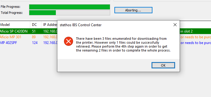 Step 3 Read log file Depending upon the selected mode, IBS CC reads 3 (one checkbox active) or 4 (two checkboxes active) files back from the device.