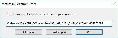 The reading may require some time. The files are retrieved form the device permanent storage 0:/pcl/ibs (IBS v2 and higher) and stored into the C:\ProgramData\IBS_CC\debugfiles\<w_x_y_z>\<date-time-stamp> (<w_x_y_z> reflects the IP address of the device).