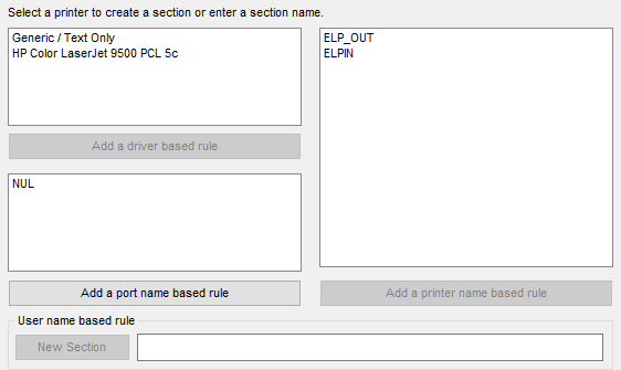 | User name based rule | Enter the Windows/Unix Logon Name of the user, for whom a specific rule is needed. ELP searches cases in-sensitive, so don't worry about upper and lower case typing. Click on the button "New section" and move on to the next step to add functionality to the new rule. |