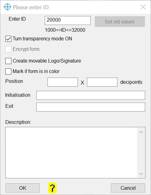 | Set old values | If the entered ID already exists then all settings from this screen can be automatically pre-filled by hitting this button. The settings are retrieved from the corresponding .MAT file which must reside in the Workpath folder. |