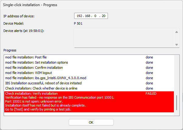• In case the last action "Check installation: Verify installation" fails and IBS CC - in terms of network - is not connected directly to the device (e.g. remotely using VPN, through VLAN, Firewalls, ...) it might be correctly installed and working anyhow. In such a case send a well-known test file (e.g. using the Test function within IBS CC) which contains barcodes and check the printout. If it works fine then you must send an offline generated license file (.pjl) to the device e.g. using TCPSEND from the cmd line or again using the Test function and send previously generated license file (.pjl) in order to license IBS properly. In both cases the device must be restarted in order to get it activated.