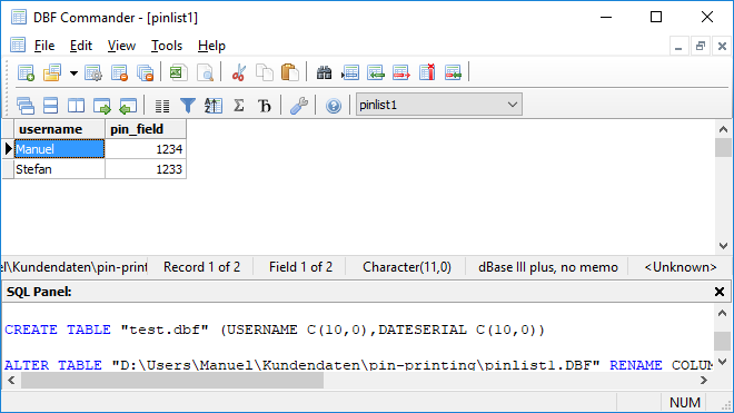 Both fields are for type string, the PIN_FIELD is length 4 and the USERNAME what ever you need. The file could be located in the workpath folder named PIN.DBF