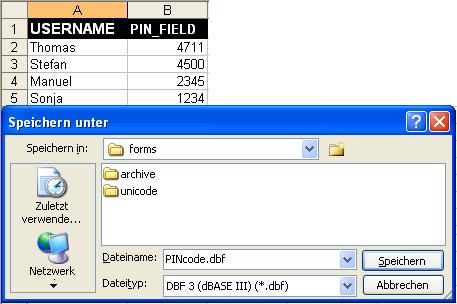 1. Create a .dbf database for example with DBF Commander and with minimum 2 fields: USERNAME and PIN_FIELD.