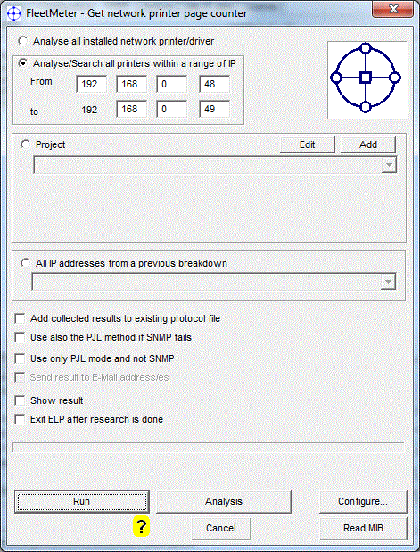 | Use PJL method if SNMP fails | offers a second way of collecting at least the total printer counter and the printer name. This method will even work, if for example the printers SNMP protocol is turned off, as some companies do. But note, this option could take a long time per IP address, which is not reachable, by default 75 minutes. See configuration page for further information. |