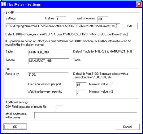 | PJL Wait time between* | ELP tries again to open a print job.If PJL is used as well for collection the printers page counter, the maximum needed time for one IP address without printer is: Amount provided ports x tried connection x delay in seconds. So the default setting takes 75 seconds. Therefore it is strongly recommended to keep the evaluated address range as sharp as possible. |