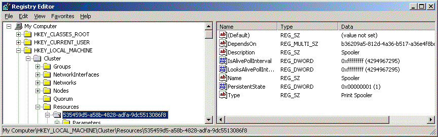 Start the registry editor and locate the cluster recourse for the print spooler. Here it's HKEY_LOCAL_MACHINE\Cluster\Resources\535459d5-a58b-4828-adfa-9dc5513086f8