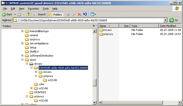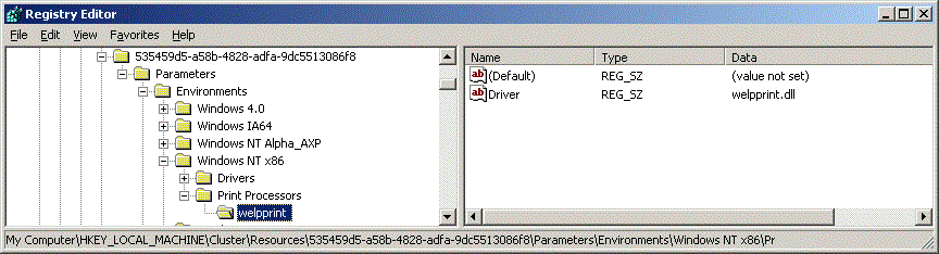 Locate the same registry hive as the clustered spooler recourse on your local system %windir%\system32\spool\drivers. Here it's 535459d5-a58b-4828-adfa-9dc5513086f8