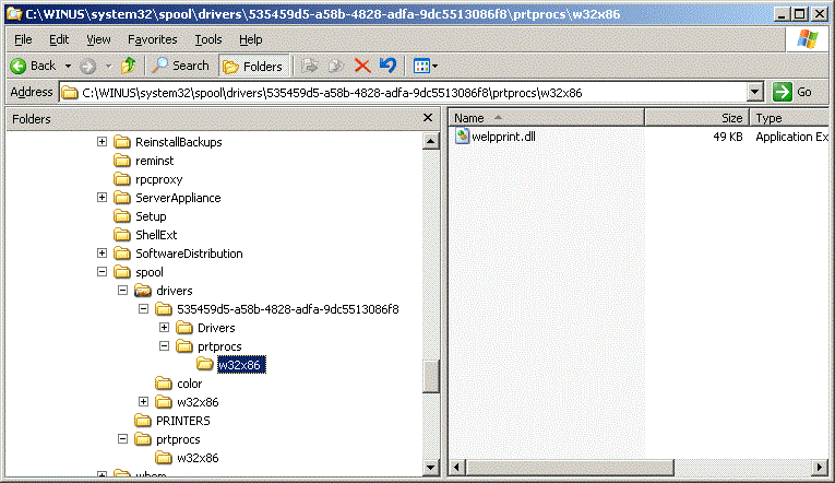 Create a subdirectory prtprocs\w32x86 within the 535459d5-a58b-4828-adfa-9dc5513086f8 sub-directory and copy the file welpprint.dll there (you will find it within the sub-directory %windir%\system32\spool\prtprocs\w32x86