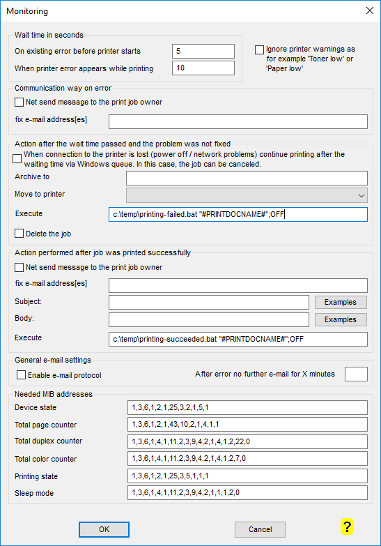 | Wait time in seconds before start | OnErrorJobStartWaitTime | Wait time in seconds for the printing process, after a printer error is detected before the first page is printed. Like Paper out or printer down. Now the Job can be moved, archived and or simply continue printing. To set this times does only make sense, if a Net Message or an e-Mail is send out. Otherwise do not use it, that the OnError keys are evaluated. |
