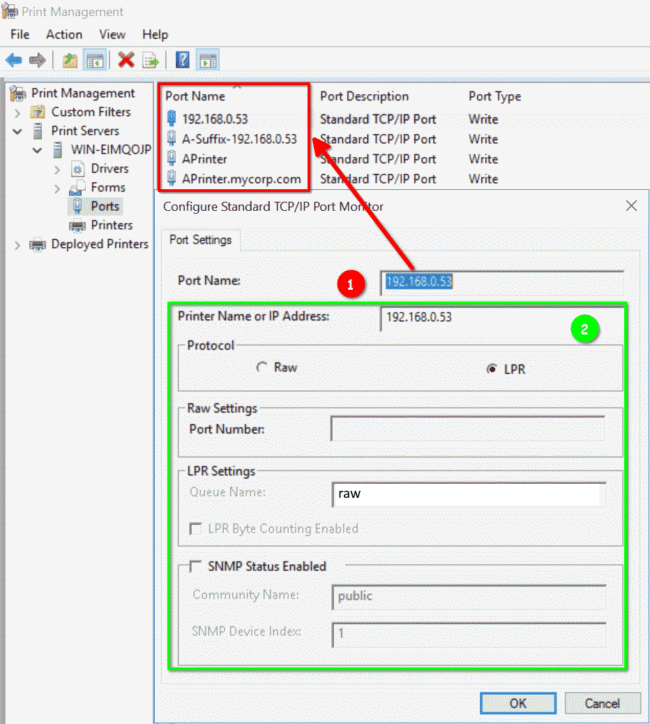 The rest of the configuration is not used for the ELP spooling mechanism at all. However you must select the LPR protocol. For HP printers the standard Queue Name is raw, for Ricoh and many others it's just lp. It is strongly recommended not to enable the SNMP Status because in some error conditions the Windows spooling mechanism holds back the job before W-ELP can control it in a proper way.