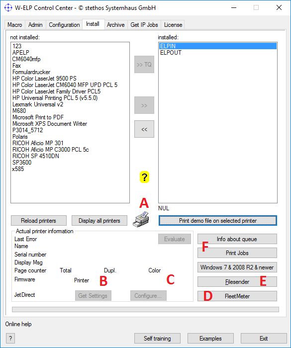 If you need to install an additional driver after the ELP Control Center is started, click on Reload printers and the driver/queue is listed in the left window.
