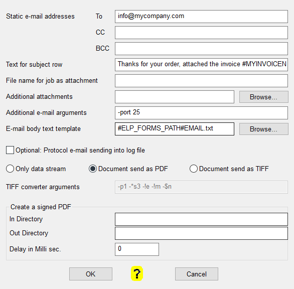 Try this one out, and insert a print field in MS Word with your e-mail address (print field). The job will arrive via e-mail twice. - If you are able to collect some unique client information from the stream, then also our database function can be used to find e-mail addresses and / or number of requested copies etc. Example: Search in the ELP database and store the fields into ELP usable variables